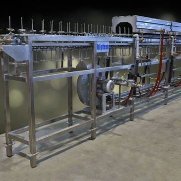 VegTech Systems offers the advanced Rod Type Roaster, manufactured by Bigtem Makine. This stainless steel machine is designed for roasting cored peppers and vegetables, loaded onto 100mm height stainless steel studs eccentrically installed on dual chain tracks with 100mm spacing. These product holders transport items through a high-temperature flame tunnel for uniform charring and flavor enhancement.