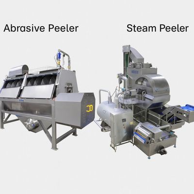 Steam peeling uses a high-pressure steam cycle followed by rapid release to remove skin cleanly. Abrasive peeling uses coated rollers and friction with water to remove skin continuously. Both are widely used in U.S. processing plants, but their performance differs significantly in yield, maintenance, and energy cost.